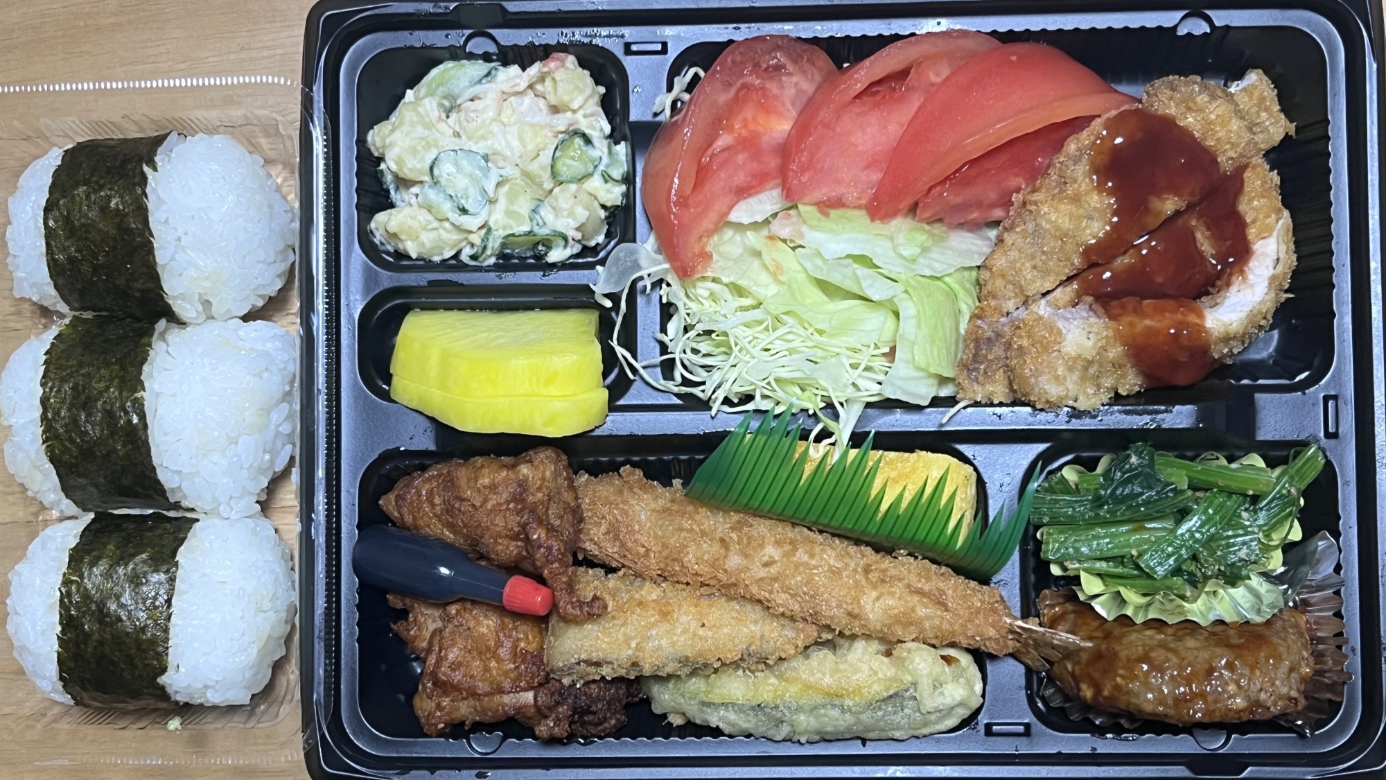 そして、今日は9回目の配食弁当………ああああああ、エビフライx3、これはぶっちゃけ、これまでサイコーの配食です!!!
