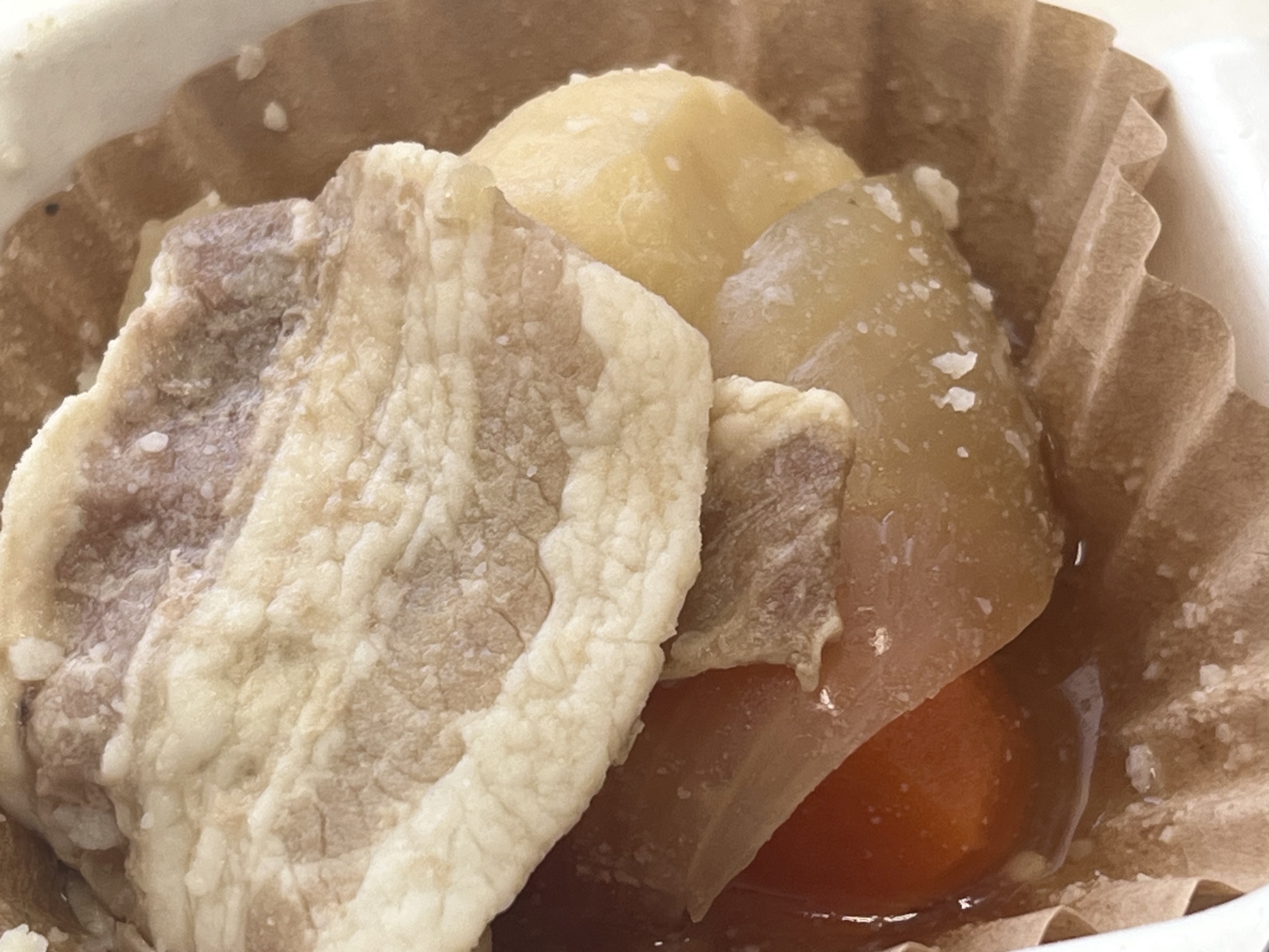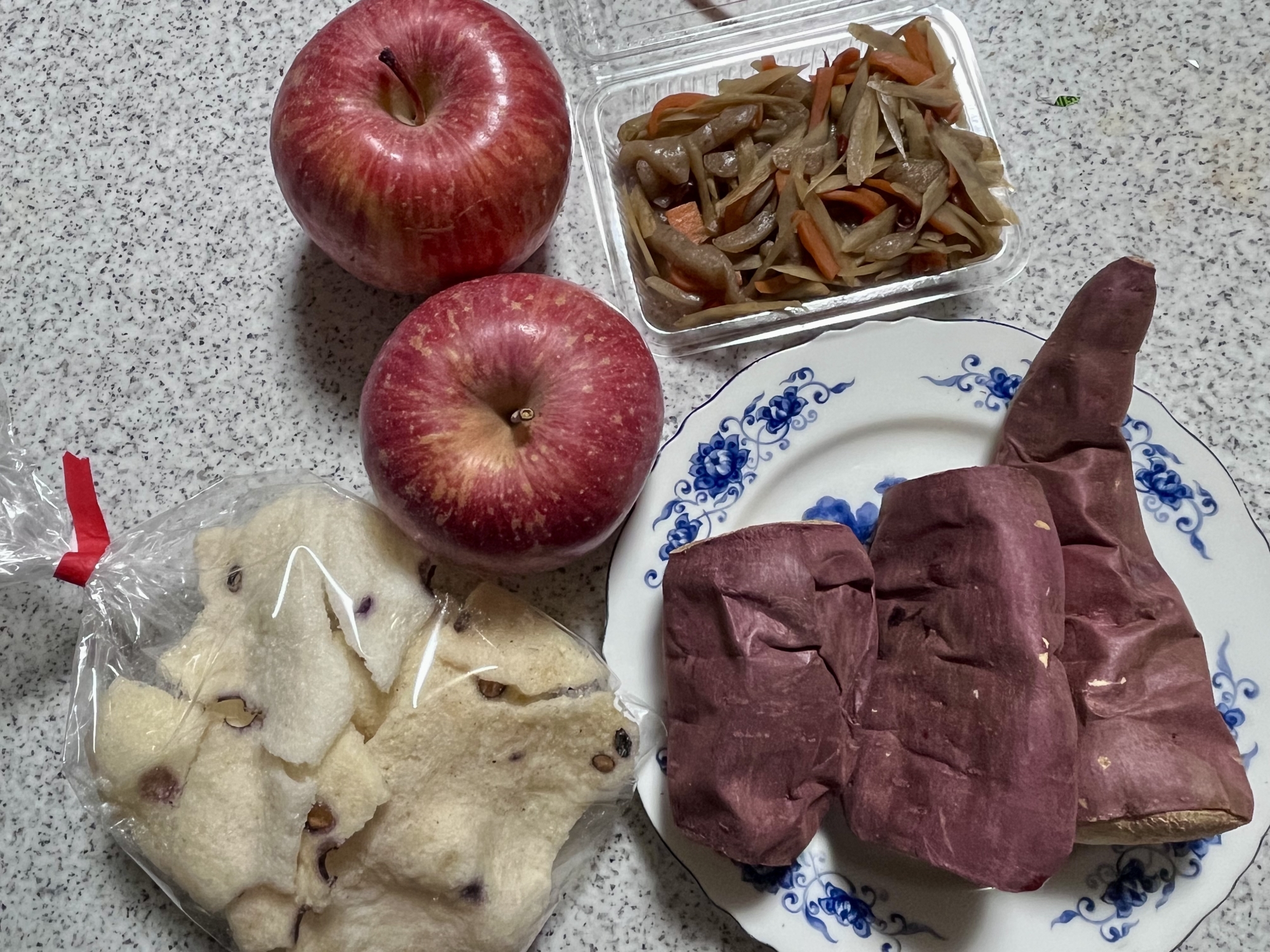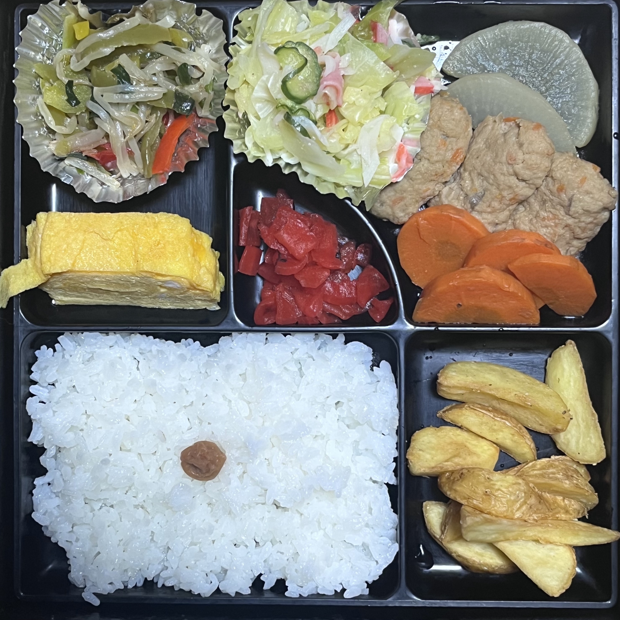 村の配食弁当のお世話になってます.昨日(2/20)、十回目,おお、ちょっとヘルシーな、これはお魚の練り物、さらに、おいもが美味しかったのですよ.いえ〜ぃ.🧡