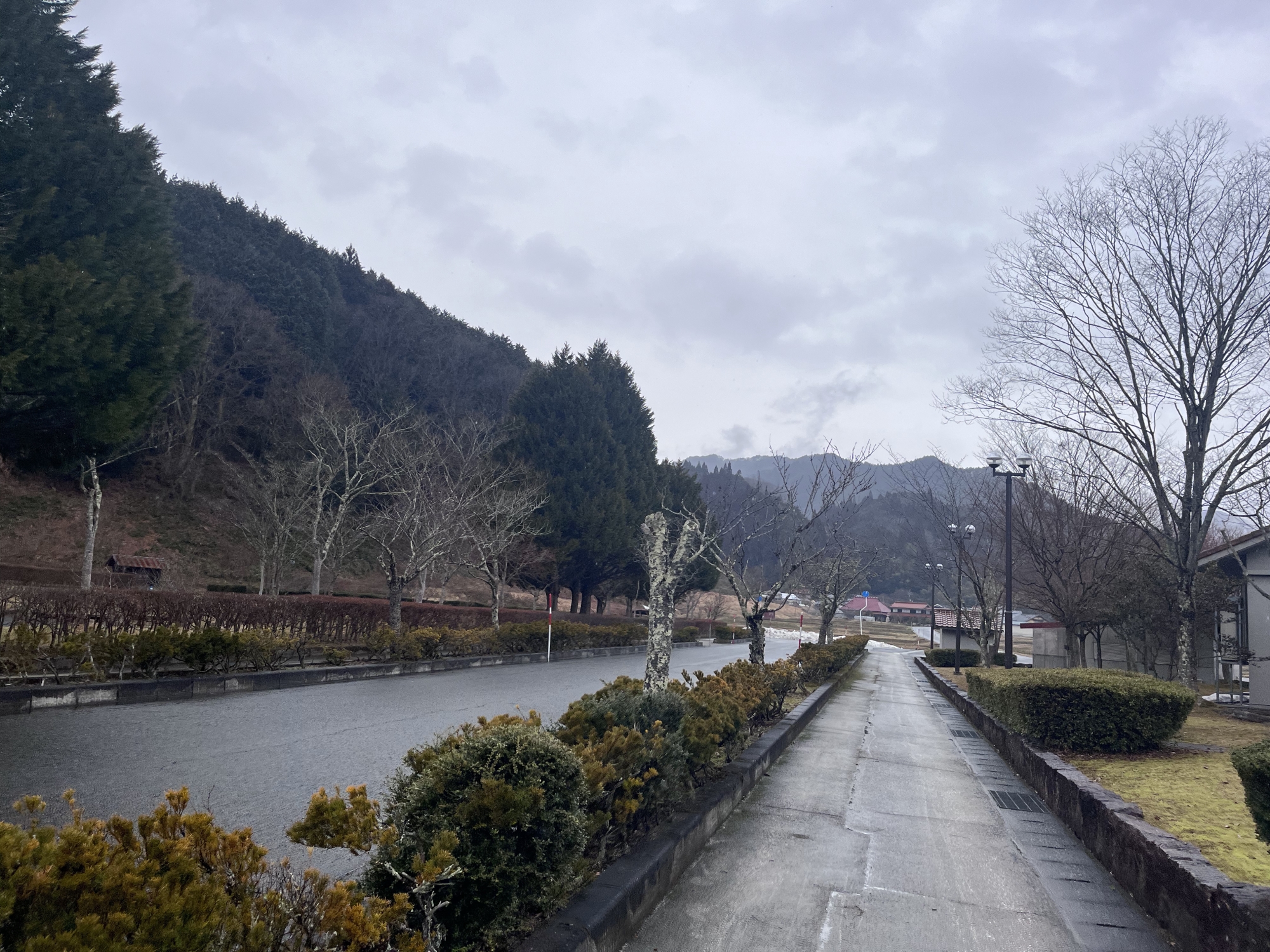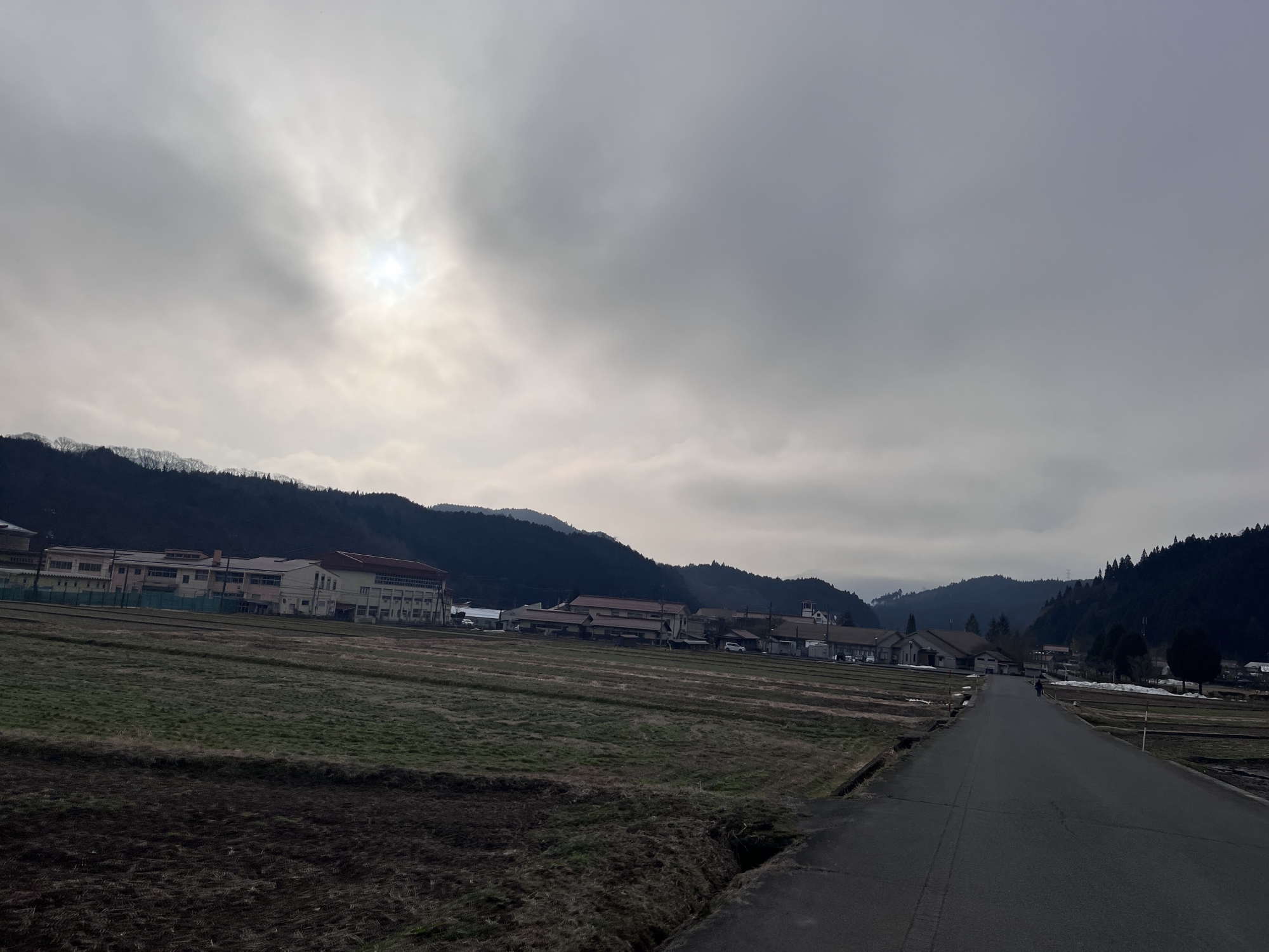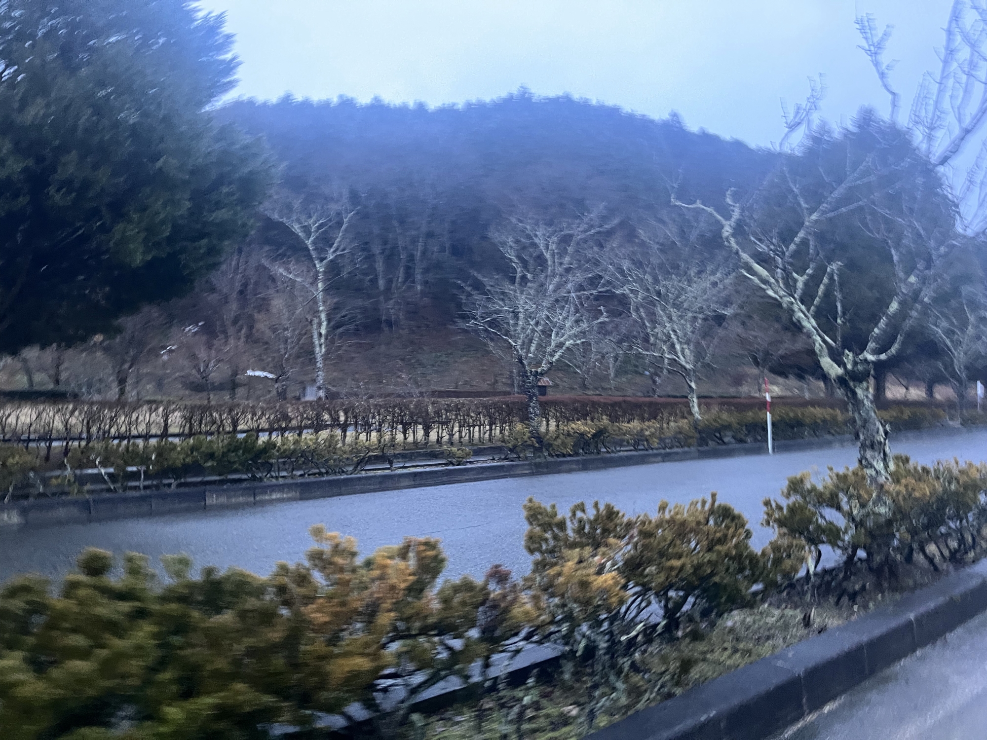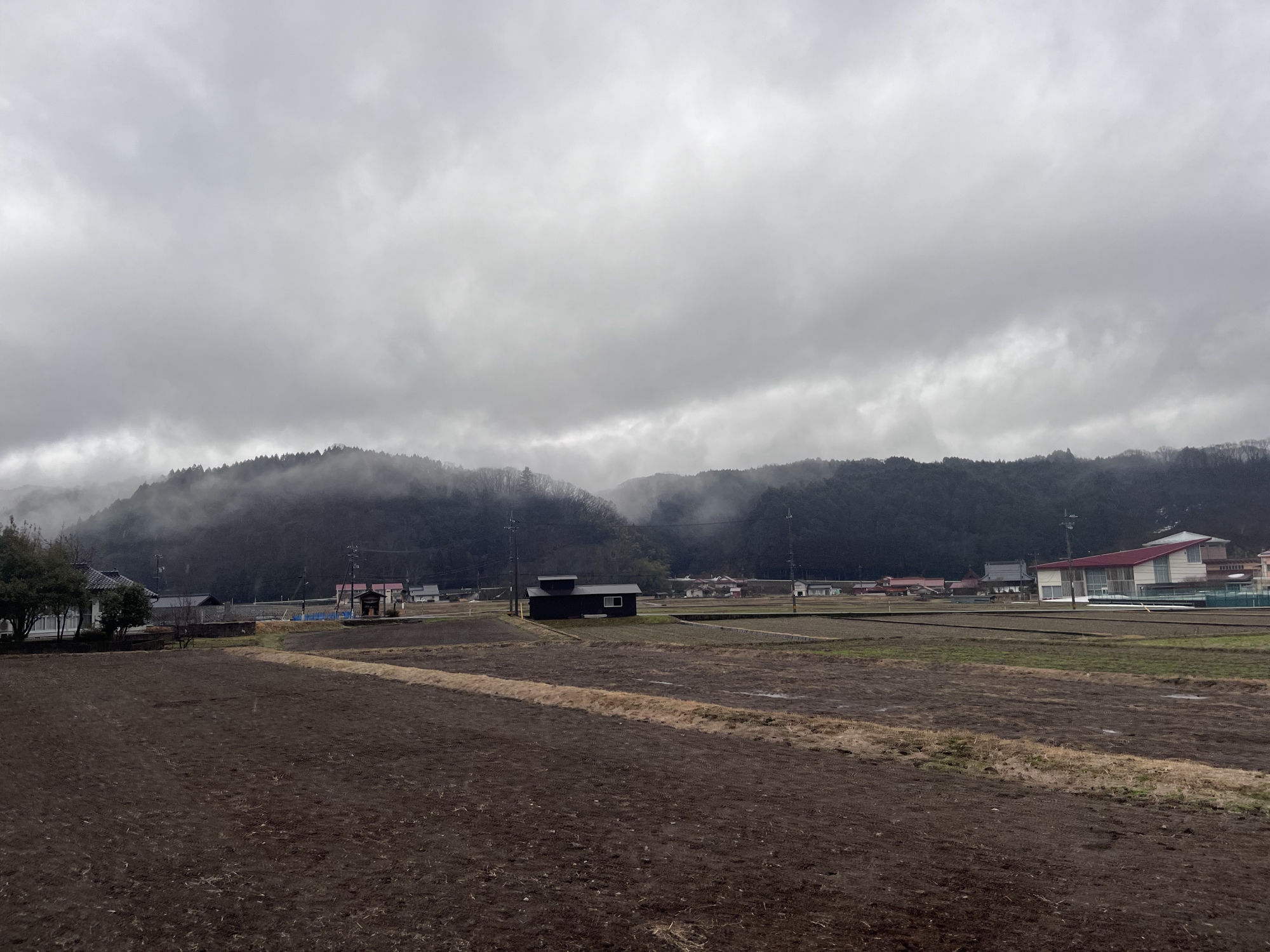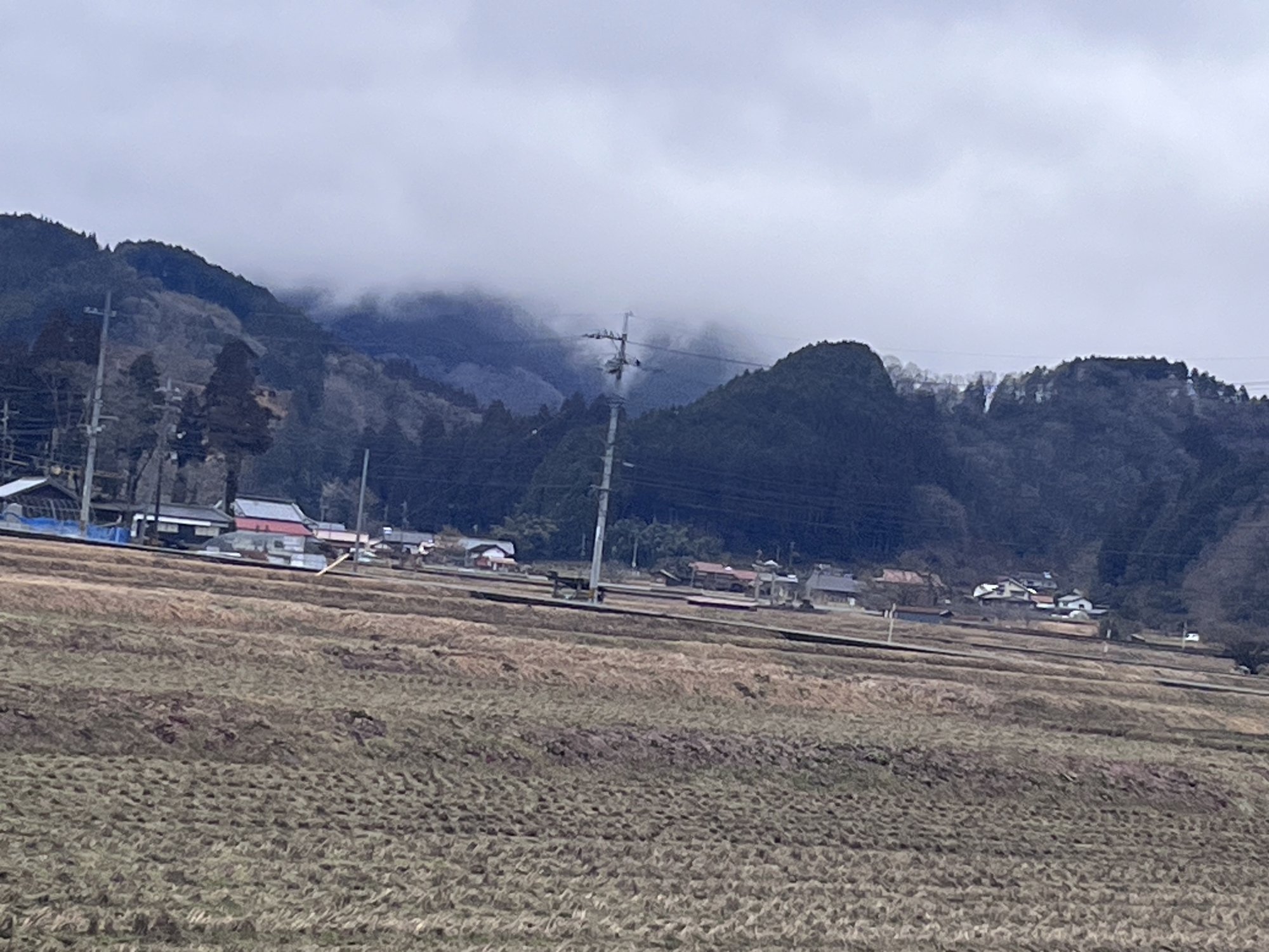 さて、帰り道……雨はほぼ已みそうだけど.低い雲.