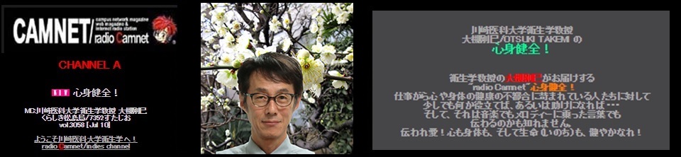 | 川崎医科大学衛生学教授 大槻剛巳/OTSUKI TAKEMI の 心身健全!衛生学教授の大槻剛巳がお届けする"radio Camnet"心身健全!仕事がら心や身体の健康の不都合に苛まれている人たちに対して少しでも何か役立てば、あるいは助けになれば
