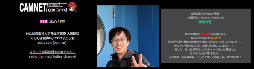 | 川崎医科大学衛生学教授 大槻剛巳/OTSUKI TAKEMI の 雲心月性!衛生学教授の大槻剛巳がお届けする"radio Camnet"雲心月性!仕事がら心や身体の健康の不都合に苛まれている人たちに対して少しでも何か役立てば、あるいは助けになれば ・・・そして、それは音楽でもメロディーに乗った言葉でも伝わるのかも知れません。伝われ愛! |