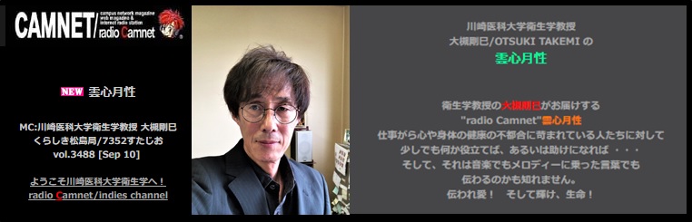 | 川崎医科大学衛生学教授 大槻剛巳/OTSUKI TAKEMI の 雲心月性!衛生学教授の大槻剛巳がお届けする"radio Camnet"雲心月性!仕事がら心や身体の健康の不都合に苛まれている人たちに対して少しでも何か役立てば、あるいは助けになれば ・・・そして、それは音楽でもメロディーに乗った言葉でも伝わるのかも知れません。伝われ愛! |