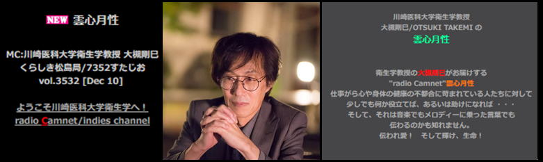 | 川崎医科大学衛生学教授 大槻剛巳/OTSUKI TAKEMI の 雲心月性!衛生学教授の大槻剛巳がお届けする"radio Camnet"雲心月性!仕事がら心や身体の健康の不都合に苛まれている人たちに対して少しでも何か役立てば、あるいは助けになれば ・・・そして、それは音楽でもメロディーに乗った言葉でも伝わるのかも知れません。伝われ愛! |