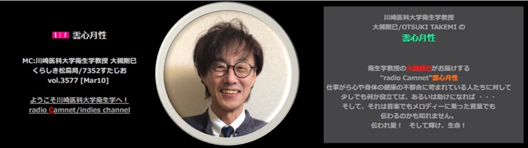 川崎医科大学衛生学教授 大槻剛巳/OTSUKI TAKEMI の 雲心月性!衛生学教授の大槻剛巳がお届けする"radio Camnet"雲心月性!仕事がら心や身体の健康の不都合に苛まれている人たちに対して少しでも何か役立てば、あるいは助けになれば ・・・そして、それは音楽でもメロディーに乗った言葉でも伝わるのかも知れません。伝われ愛!