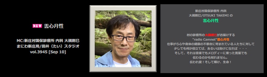 | 村の診療所の大槻剛巳がお届けする"radio Camnet"雲心月性!仕事がら心や身体の健康の不都合に苛まれている人たちに対して少しでも何か役立てば、あるいは助けになれば