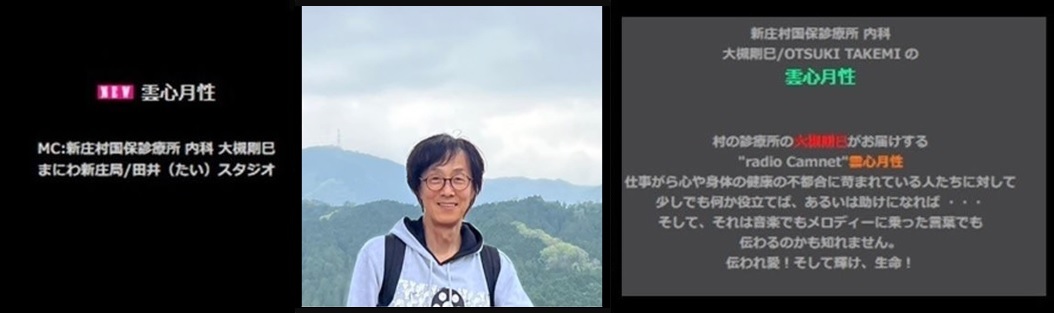 村の診療所の大槻剛巳がお届けする"radio Camnet"雲心月性!仕事がら心や身体の健康の不都合に苛まれている人たちに対して少しでも何か役立てば、あるいは助けになれば ・・・そして、それは音楽でもメロディーに乗った言葉でも伝わるのかも知れません。伝われ愛!