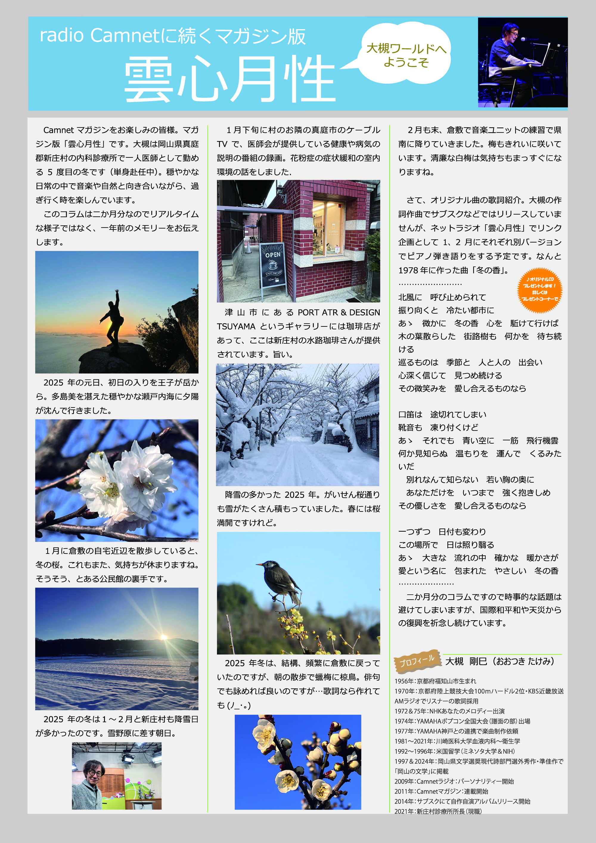 Camnet は元々,フリーマガジンとして登場し,現在はWEB-Magazineとなっています。2011年15号(10-11月号)から,連載を始めました。本当に徒然なるままにですが,「ちょっと寄り道/ブラ@タケミ」の様子などを紹介していました。 2017年5+6月号からは、大学の教員部屋に川崎医学会として、機関誌への投稿促進のスライドを前半2枚+後半2枚、流していて(イラストは Ms. Keiko Chikara)、季節に合わせて1年前のコンテンツを紹介する形式にしています。
