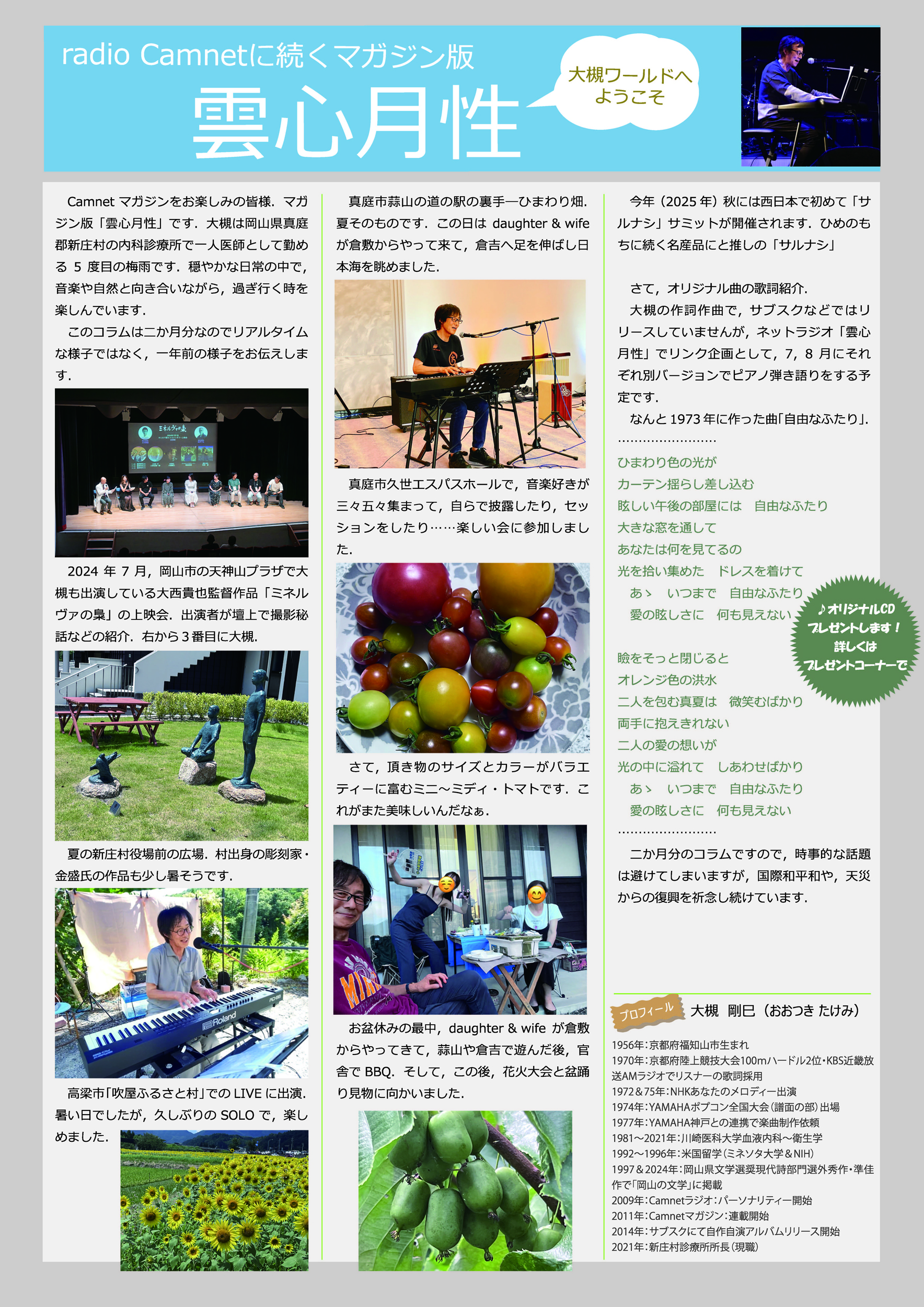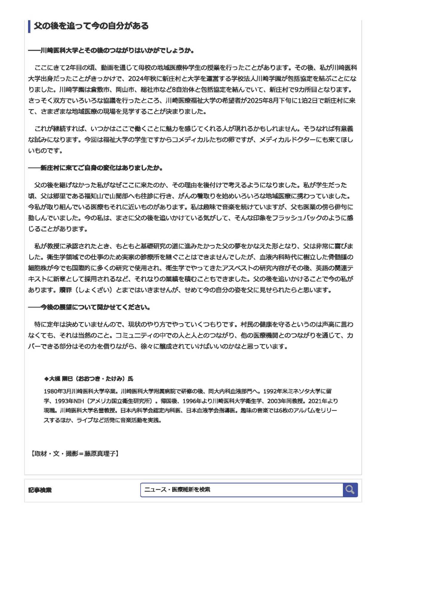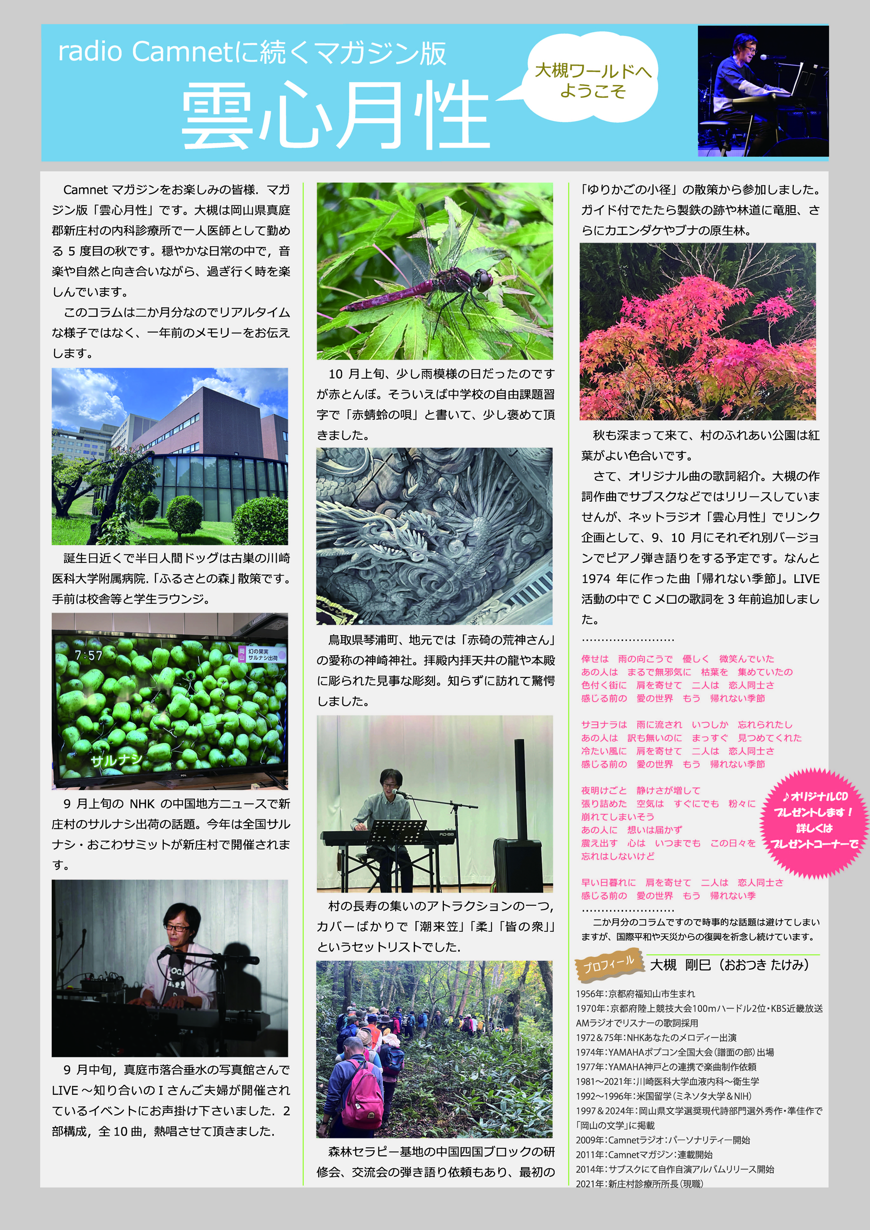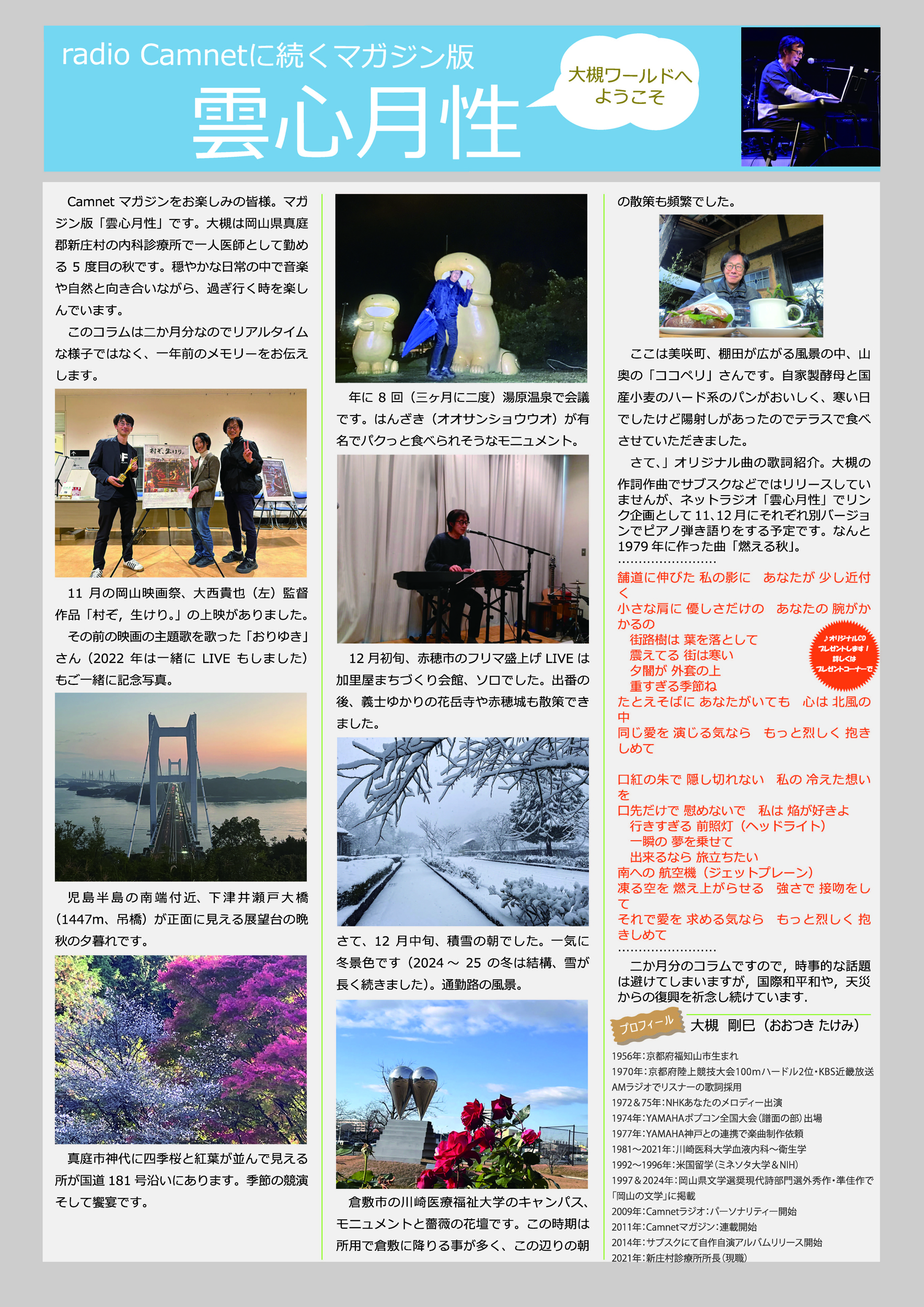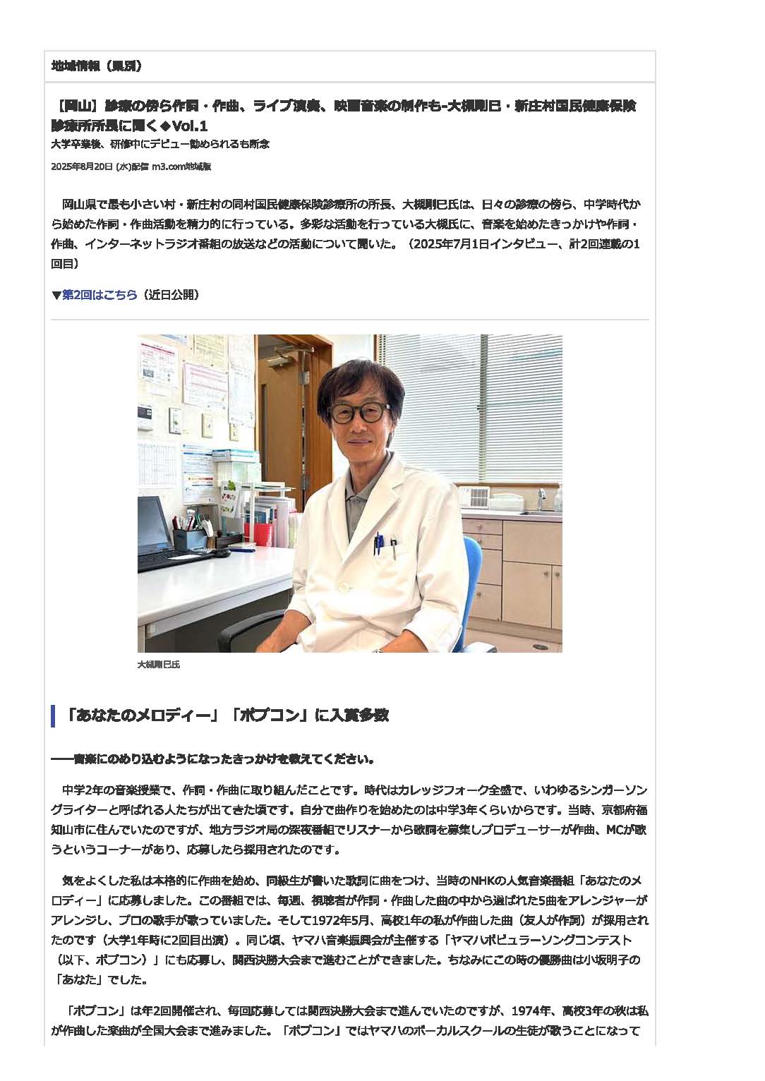 20025.8/20&27:医療ポータルサイトm3のニュースの地域版に、【岡山】診療の傍ら作詞・作曲、ライブ演奏、映画音楽の制作もー大槻剛巳・新庄村国民健康保険診療所長に聞く ◆Vol.1 ◆Vol.2 岡山県文学選奨:平成8年度、令和5年度:現代詩部門「選外秀作」、「準佳作」で掲載されました。